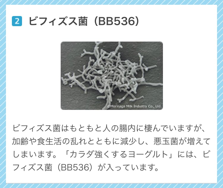 ビフィズス菌はもともと人の腸内に棲んでいますが、加齢や食生活の乱れとともに減少し、悪玉菌が増えてしまいます。「カラダ強くするヨーグルト」には、ビフィズス菌(BB536)が入っています。